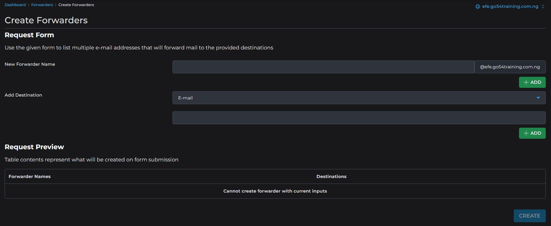 Forwarder Name: The email address you want to forward from (e.g., info@yourdomain.com).